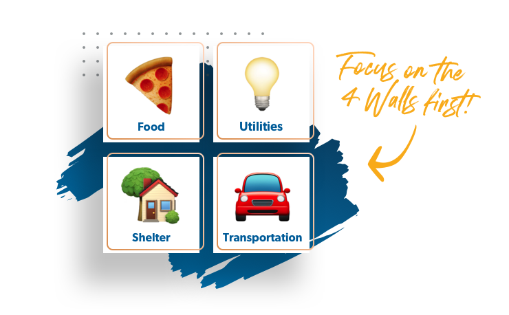 Credit cards and student loans are examples of unsecured debt—that means the lender can’t take anything away from you (like a car or a house). Unsecured debt is typically going to be the last debt you pay if you’re in trouble. The first debt you pay should be something they can take, so make sure you focus on the Four Walls first: