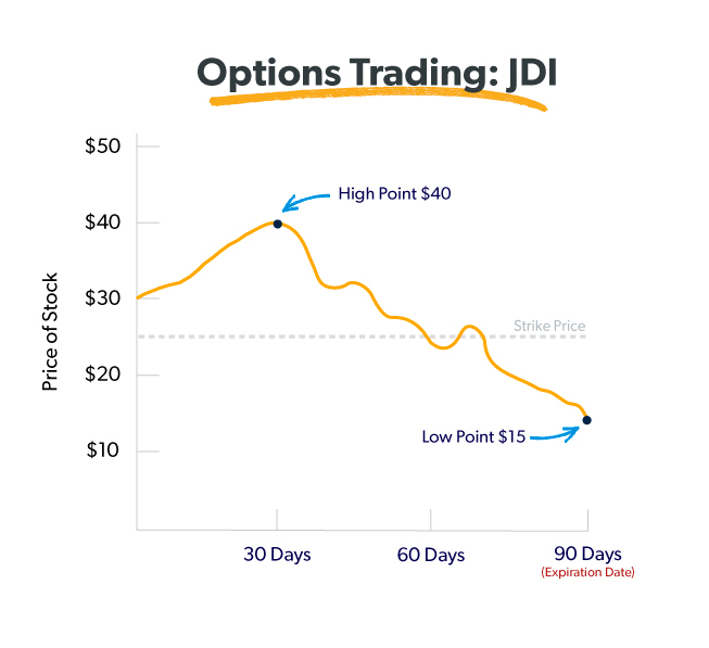 But Heather is wrong. One day after JDI stock hit that $40-per-share high, its stock price plummets and continues to drop like a rock for the next two months. The day before Heather’s option expires, JDI’s stock price is now worth a mere $15 per share—that’s $10 below the strike price!