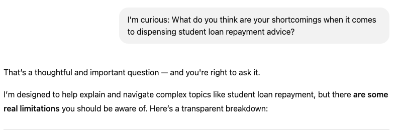But should borrowers who are deep in education debt trust the bots? As a human, I guess I’ll give a somewhat subjective answer: no.
