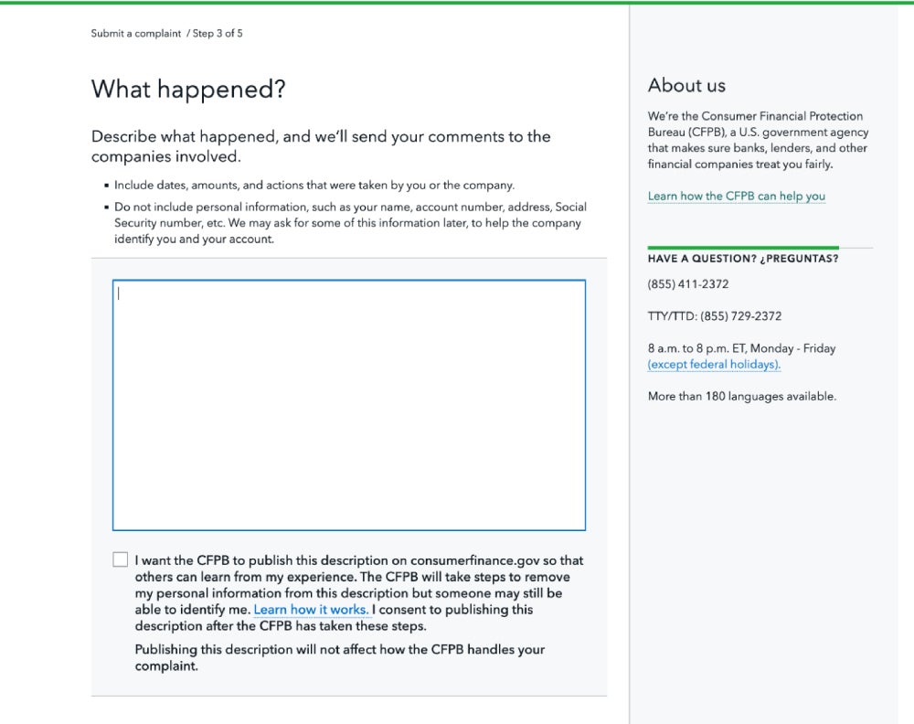 At this step, you’ll also be able to indicate whether you’re OK with the CFPB publishing the description of your complaint to its website. (The CFPB will take steps to remove your personal information, so that you can’t be identified.)